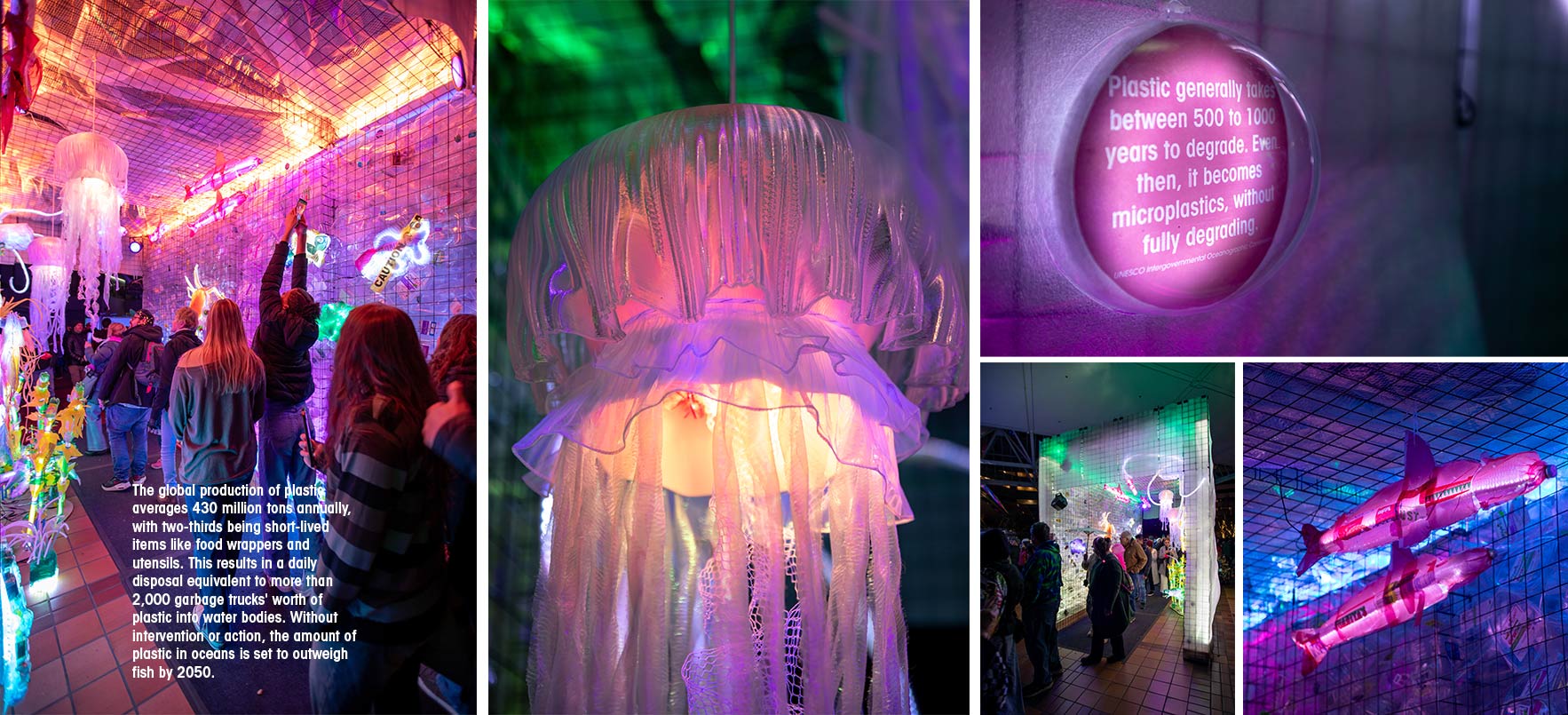 Through "the prismatic plastiquarium," our aim was to foster an appreciation for the beauty of our oceans while also raising awareness about the consequences of plastic pollution. By combining the captivating allure of light with the harsh reality of the plastic crisis, we hoped to motivate action. Our goal was for every attendee to depart with a renewed dedication to ocean conservation, understanding that our present actions profoundly influence the future of our seas. This interactive exhibit illuminated the ocean's splendor and underscored the impacts of our everyday plastic usage.